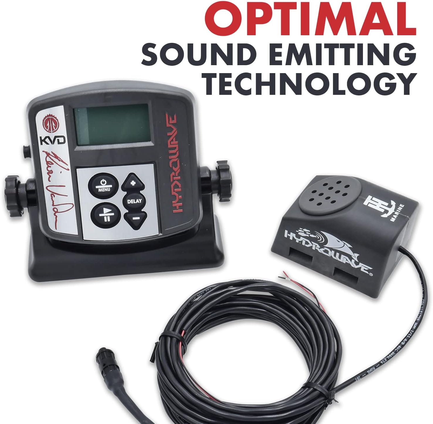 The HydroWave KVD H2 is a Marine Audio Device based on the reactive senses of a Bass and other predatory fish. The HydroWave H2 delivers the latest in patented, sound emitting technology, effectively imitating the audible underwater sounds of baitfish and fish-feeding activities. Research has proven these sounds stimulate feeding in game fish.