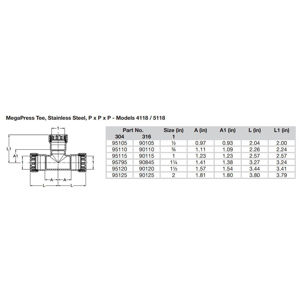 MegaPress 3/4" Stainless Steel 304 Tee - Triple Press Connection - Smart Connect Technology